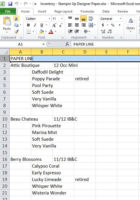 While I was at it I made an Excel spreadsheet inventory of the Stampin Up Designer Paper I have, don't ask me why I did that because I have no idea other than I like making inventories of some of my crafting items. But I do plan on going in and marking which cardstocks I do own *okie honestly believes this need to organize is a curse at times*. Honestly though, it will make it easier to just open up the Excel file and quickly see if I have what matches instead of having to rummage through my papers. By rummage I mean pull out the folder with paper which is organized by color and check the name on the tab.